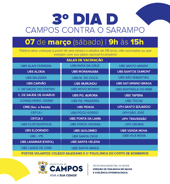 Neste sábado (7), a Secretaria Municipal de Saúde (SMS), promove mais um Dia D de vacinação contra sarampo. O terceiro este ano. O público-alvo da campanha são crianças a partir de seis meses a adultos de 59 anos - não vacinados ou que estejam com seu plano vacinal incompleto. A fase da vacinação referente a campanha deste ano disponibiliza doses do sarampo enquanto a circulação do vírus estiver ativa no Brasil.